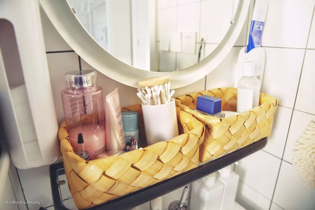 上面放置的两个竹篮,原来是我摆拍面包的道具,现在分别收纳两个人的护肤品。