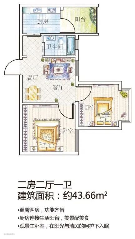 建筑面积43.66㎡的两室一厅,基本已经小得不能再小了。