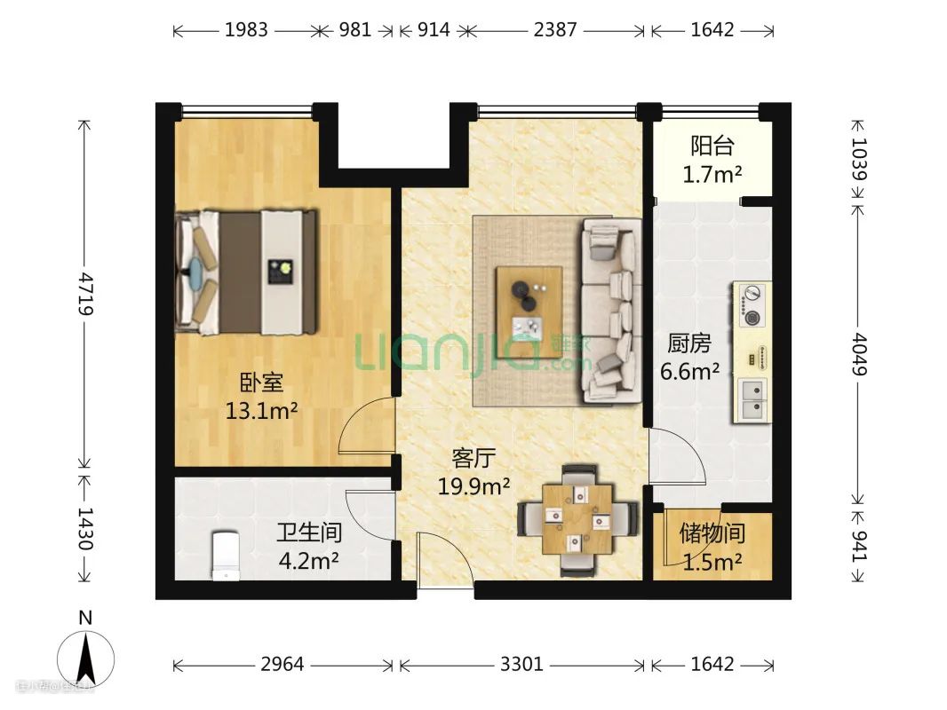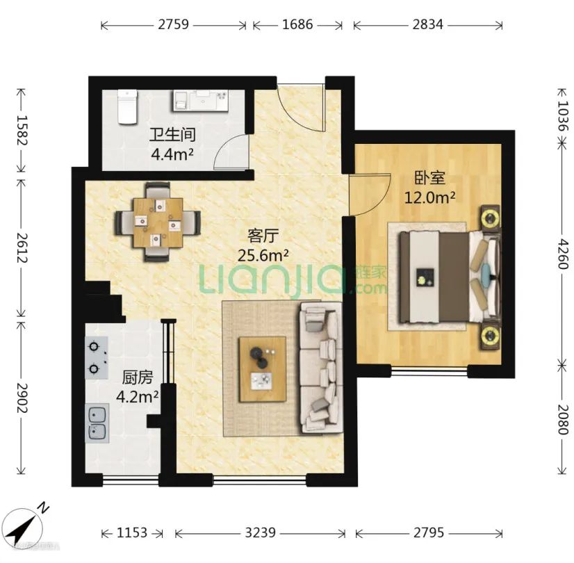 测算实用面积约34㎡,单面采光,厨卫全明,几乎没有空间浪费。