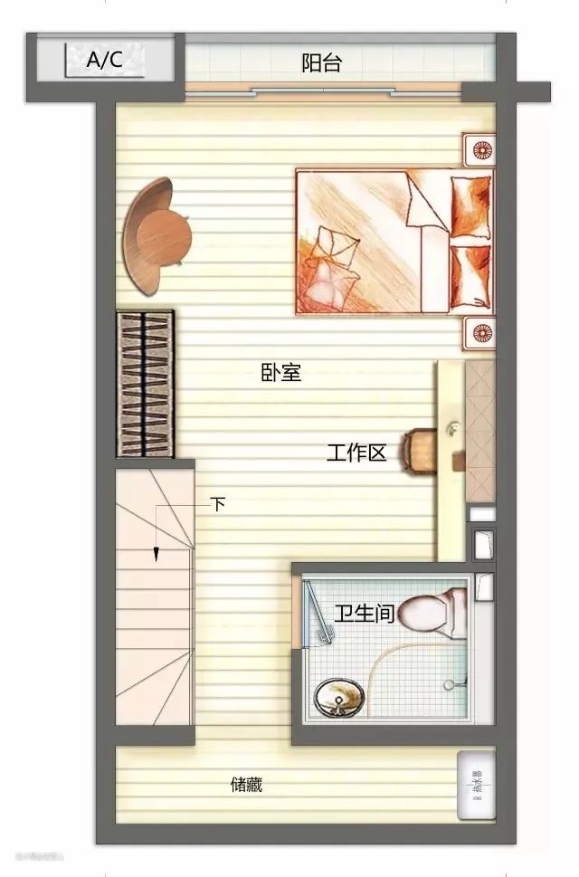 麻雀虽小五脏俱全,上下双卫设计,如果有需要,工作区还可以分割出一个独立房间。