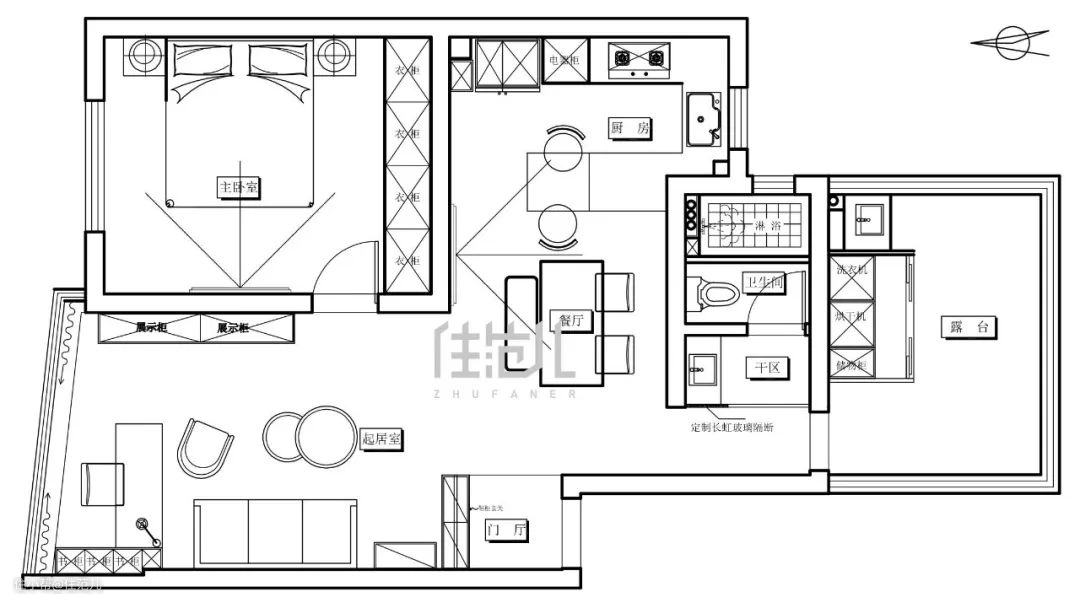 靠内一侧的暗空间,就安排给了走廊、卫生间、储物间,空间利用非常合理。