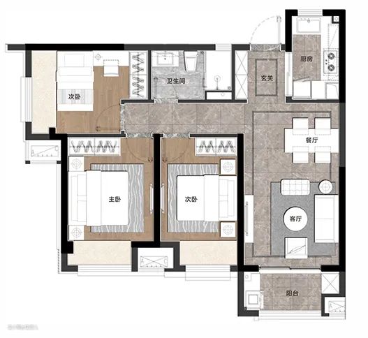 这种小厅大卧的户型,其实很适合在主人床边放婴儿床,或者提供给需要用轮椅的老年人居住。