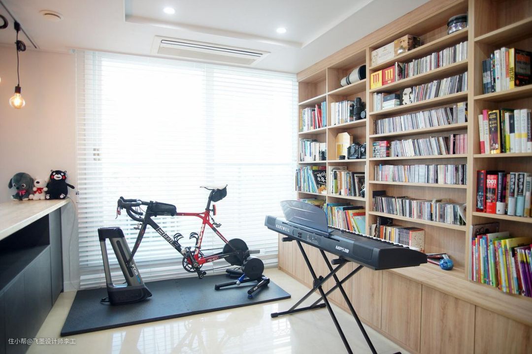 沙发的后面就是业主后加的储物柜了,既能收纳,还能充当客厅茶几使用。柜子的另一边是个书房+健身房,整面墙的书架上放满了书,还有一些简单的健身器材。家里这样设计客厅,相信即使是疫情宅在家也不会觉得无聊吧!