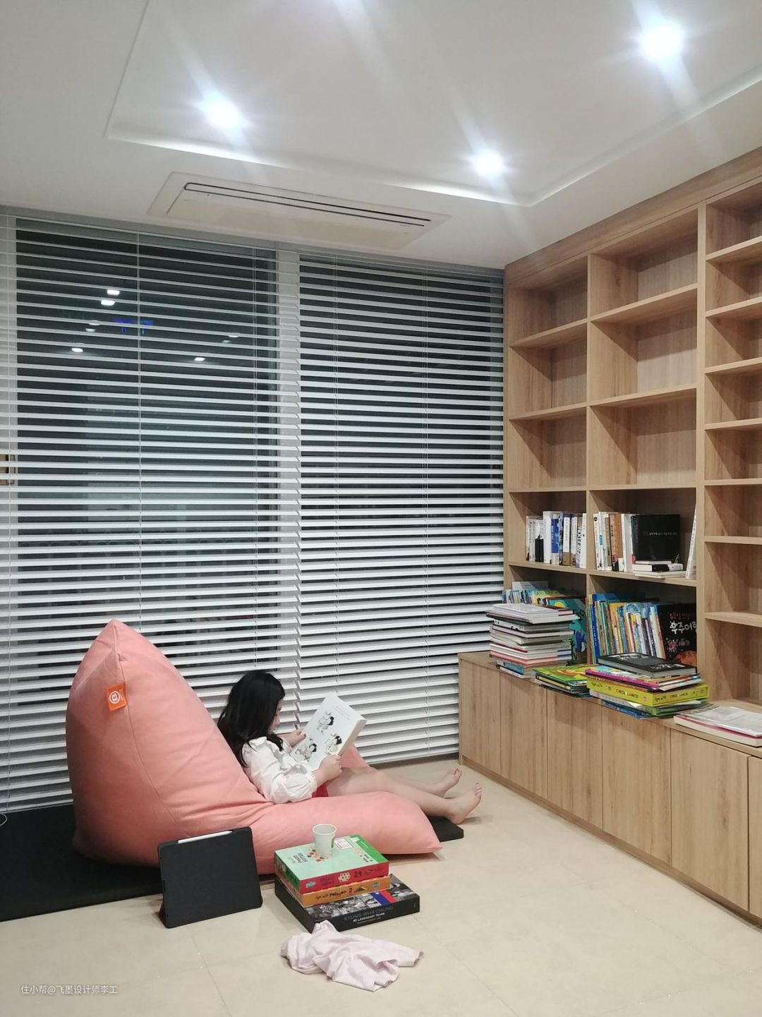 平时把健身器材收起来,女儿就喜欢窝在懒人沙发里看看书。