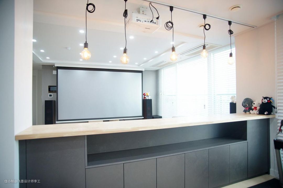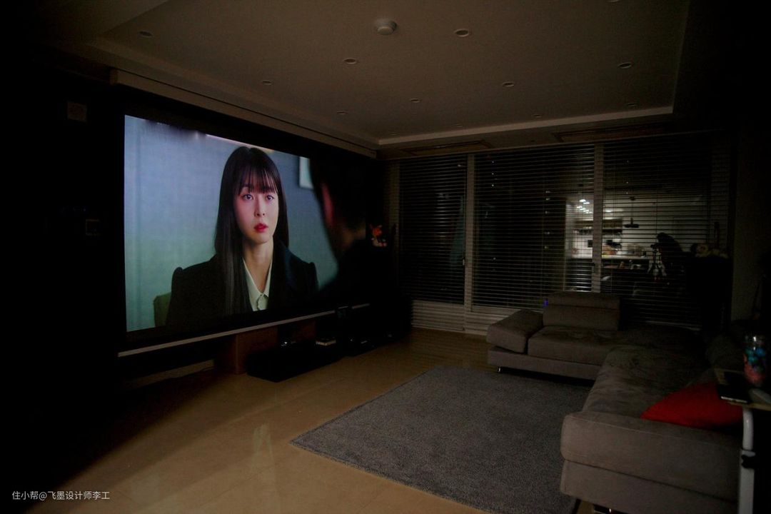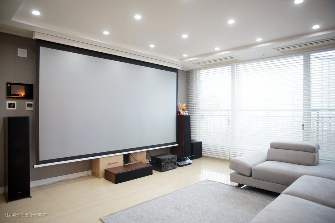 客厅空间很宽敞,再加上落地窗,采光也不错。沙发对面并没有想象中的电视柜,业主选择了投影仪,平时都是藏在吊顶上,不占空间。左右两边各放一台音响,在家看电影超爽的,不过隔音措施一定要做好,不要吵到隔壁邻居。