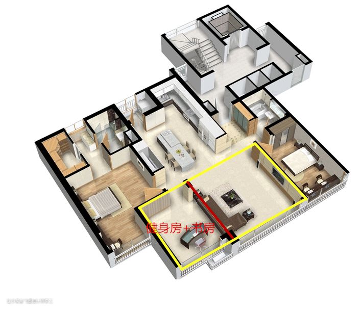这套房子户型其实还算方正,面积130平,客厅就有20平,单纯地只放沙发电视也太空了,大客厅可以选择在沙发后面打了一个长3m的矮柜,增加了一个小书房兼健身房,既多了收纳空间,又能宅在家里健身。