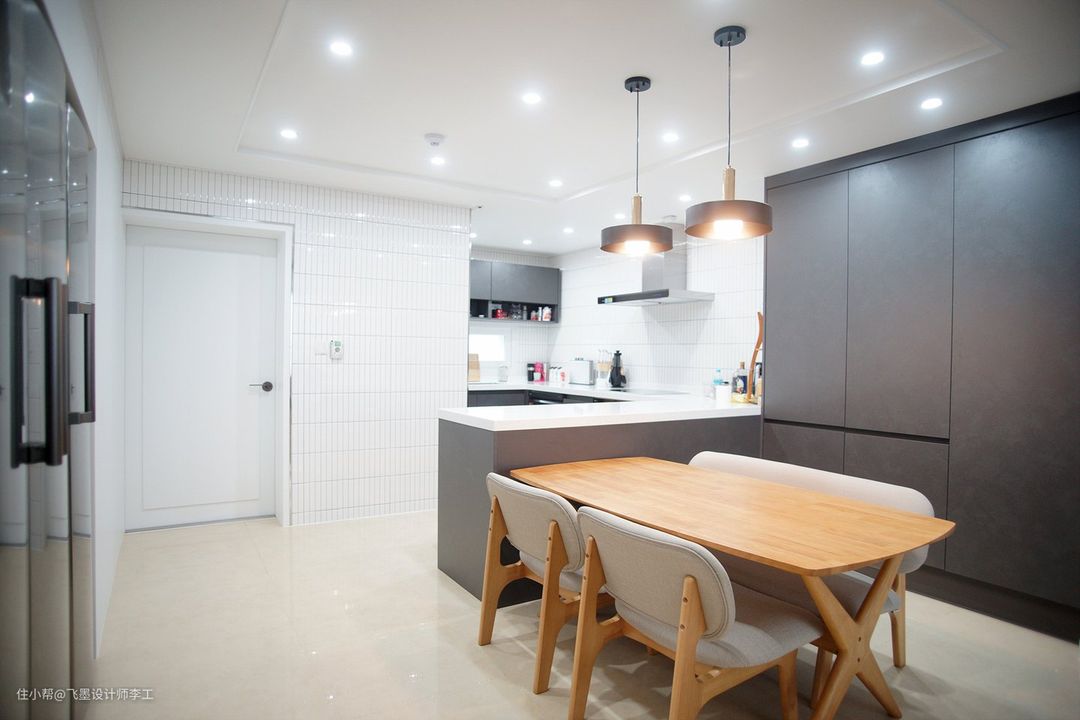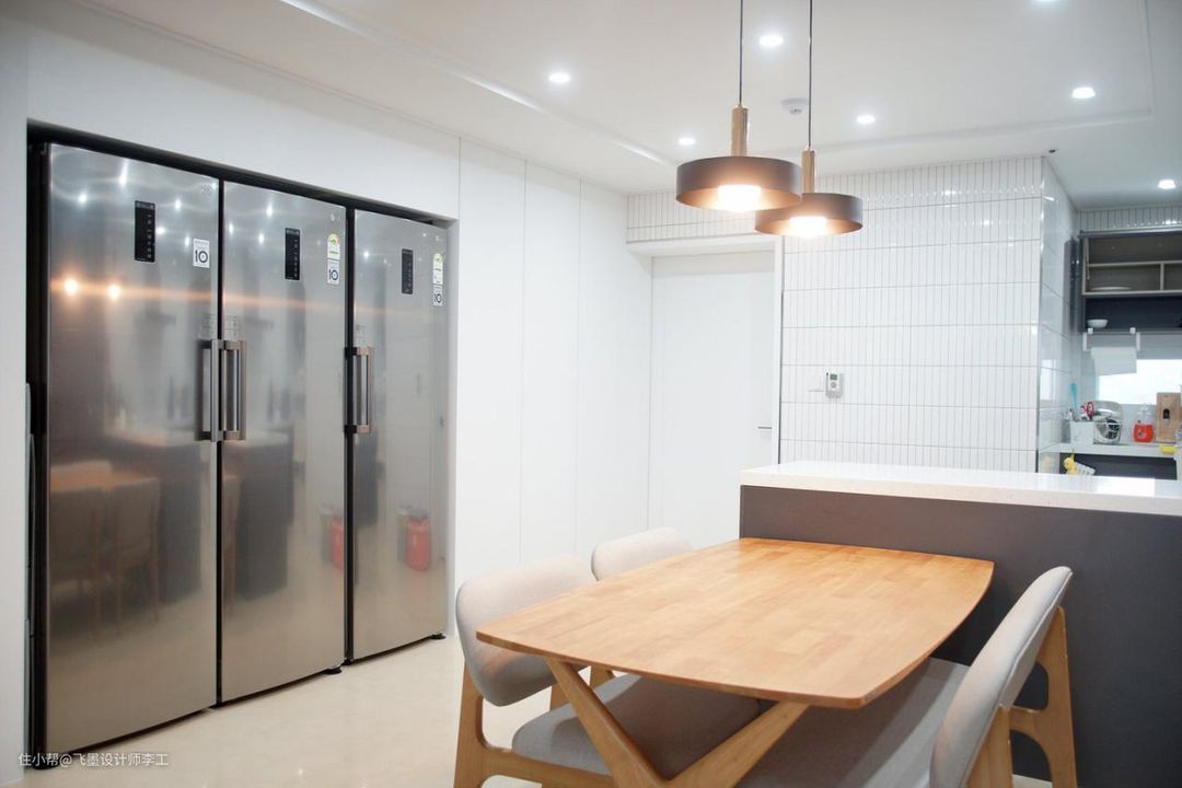 很多人吐槽过业主家的餐桌很像儿童餐桌,其实这不仅是餐桌,还是女儿平时写作业画画的书桌。后面的墙上满满都是柜子,这是我见过收纳空间最大的餐边柜了。