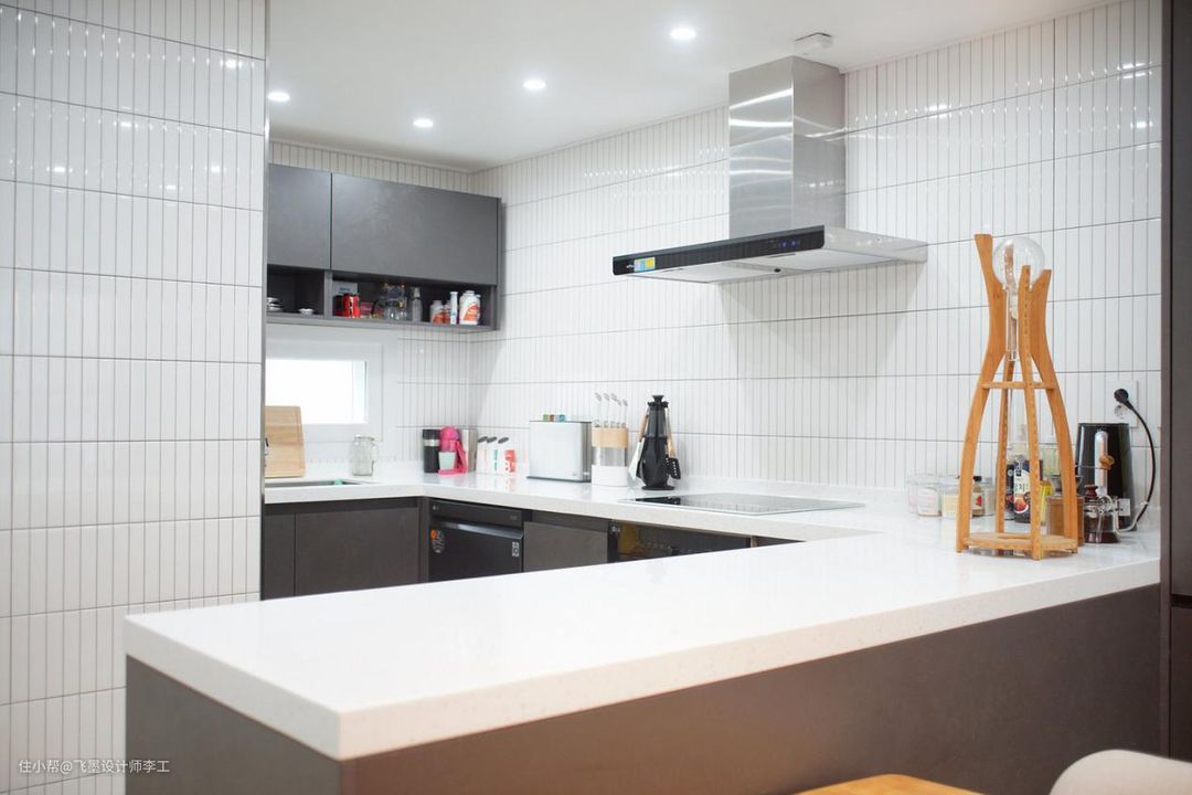 厨房在拐角的位置,U型橱柜台面宽敞,收纳空间充足,动线合理,特别适合一些宽敞的厨房,灶台延伸出来的部分可以作为备菜区或者是吧台使用。