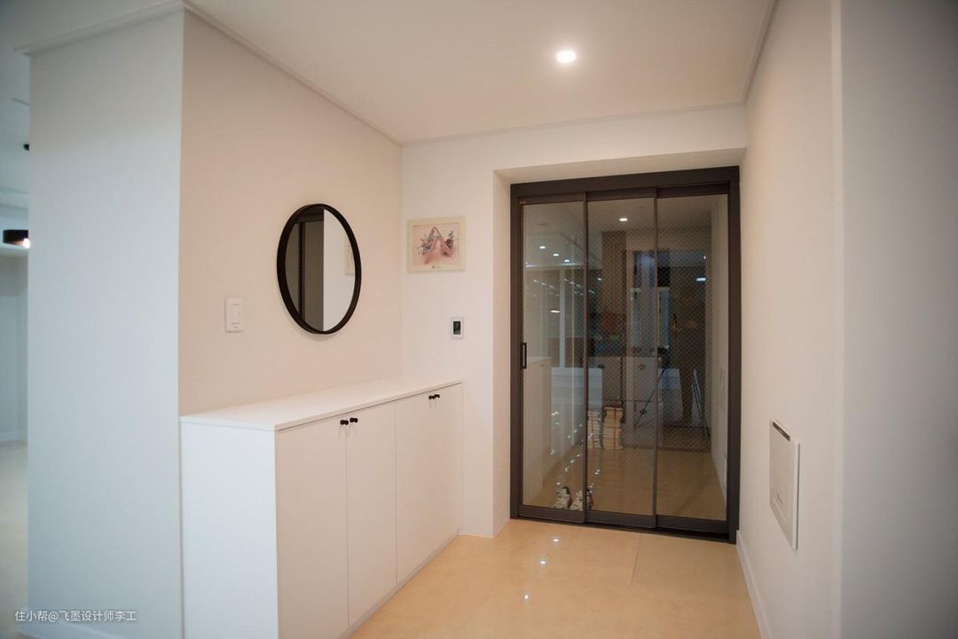 玄关是典型的韩式设计,用玻璃推拉门单独隔出一个空间,进门处不仅有鞋柜,还有镜子可以整体着装,要是再加上换鞋凳就完美了。