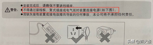 如果你认真读说明书的话,就会发现里面明确注明:“不得通过接线板、复式插座或电气延时装置连接电源”。