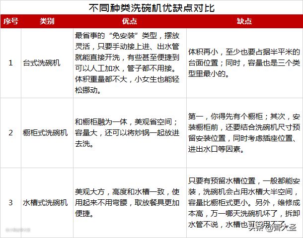 缺点:只要有预留水槽位置,一般都能安装,洗碗机会占用水槽大半空间,容量比橱柜式更小。另外,维修成本高,万一哪天洗碗机坏了,拆卸水管不说,水槽也可能用不了。