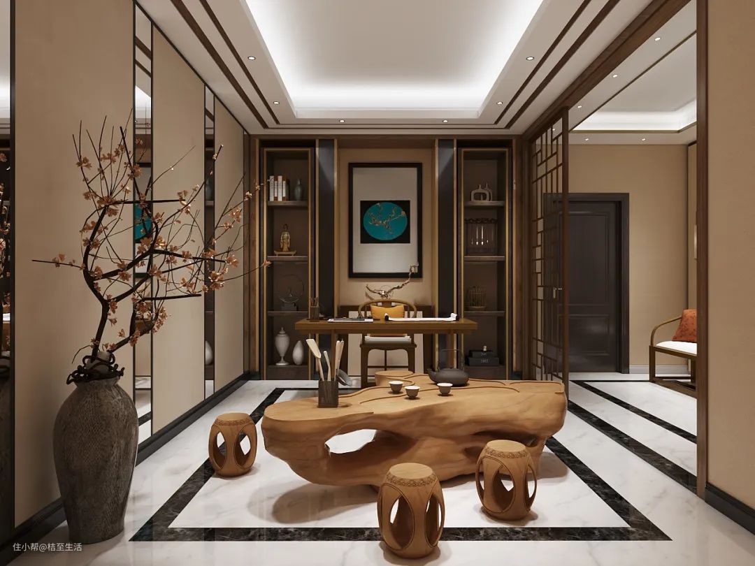 可以在客厅单独划分出一块区域用来放置茶室,适合面积较大房间,中间用木格栅或者屏风来划分空间;甚至可以在其他空间零碎地“植入”茶桌,例如客厅的茶几处,以及沙发后面都是摆放茶台的好地方。