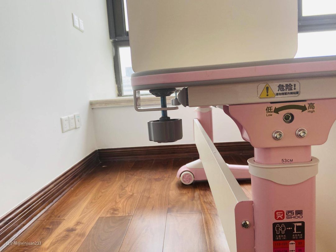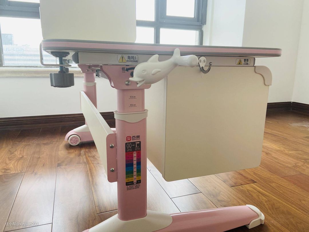 这款升降桌采用的是手摇的方式,摇柄设计成了一个非常可爱的海豚型,很适合小宝贝的口味。桌子支持53-76CM高度调节,设计方面比较科学,配合套装内的升降椅子,可以陪伴小宝贝一直成长。