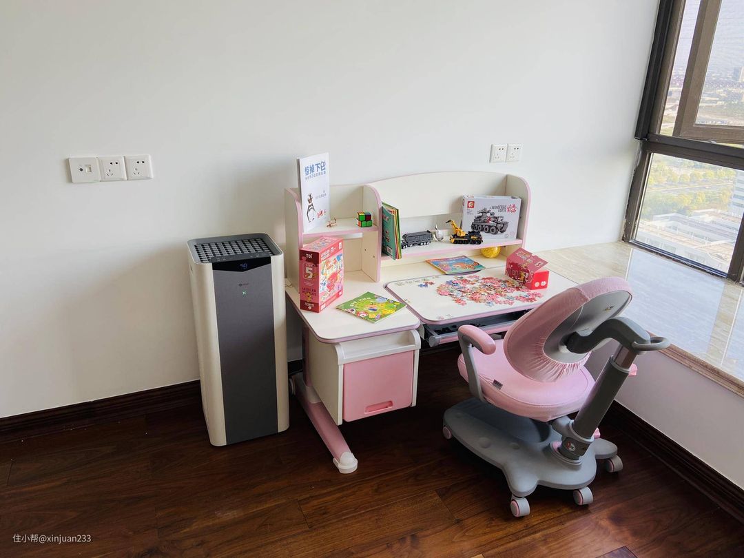 空气净化器出现在这里,可能有的朋友们觉得有些突兀,其实我有我自己的考虑。熟悉我的朋友可能都知道,我绝大部分文章都是基于新房装修的纯分享文,这篇儿童空间打造攻略1.0,你们从我拍照的环境看,就应该知道了。没有完全撤走的保护、散落的扫帚和小物件,都反映了这里刚装修完没多久,没有实际入住。是的,就是这样。虽然通风的时间很长,接近一年。但是对于装修的材料和施工工艺的方面,我仍旧有自己的担心。即使我选择了水性漆、纯实木地板、E1级板材的柜子,我也依旧没法保证100%的安全,因为毕竟涉及孩子。所以我购入了一个小巧版本的352 X50S 空气净化器,一方面除甲醛(虽然我自信的认为按照我的选材标准应该是不存在甲醛超标的),另一方面除一除空气中的PM 2.5,毕竟空气质量不仅仅是甲醛这一个指标。