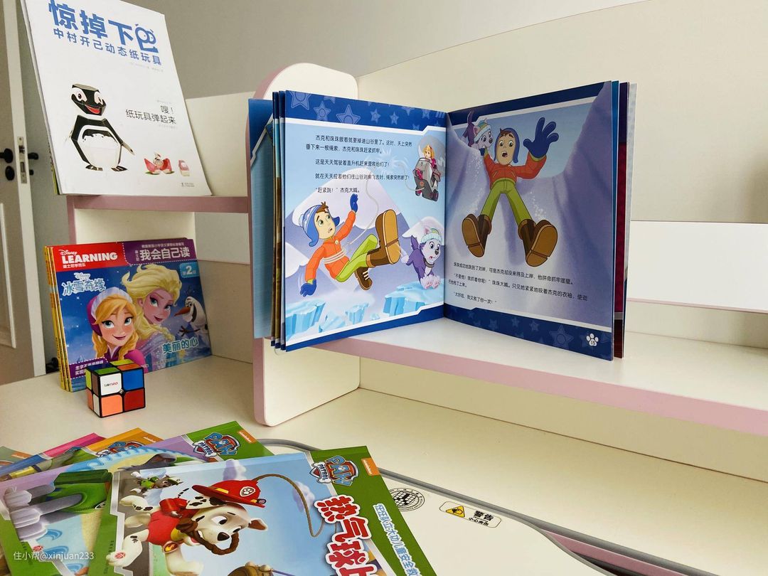第二本就是《汪汪队》了。现在《汪汪队》真是每天海陆空全方位轰炸我,iPad Pro提供动画版、牛听听提供语音版、然后就是这些纸质的书,好几个故事我都快背下来了,小娃娃自己都快会模仿其中的桥段了,比如狐狸先生的商店,松鼠警官之类的,真是太魔性了。