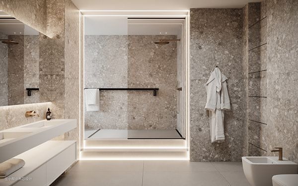 还可以增加辅助光,会让空间更明亮,可以在洗漱区、马桶区、淋浴区加适当辅助光,让整个空间主光源和辅光源相互配合,空间既有层次感又明亮。
