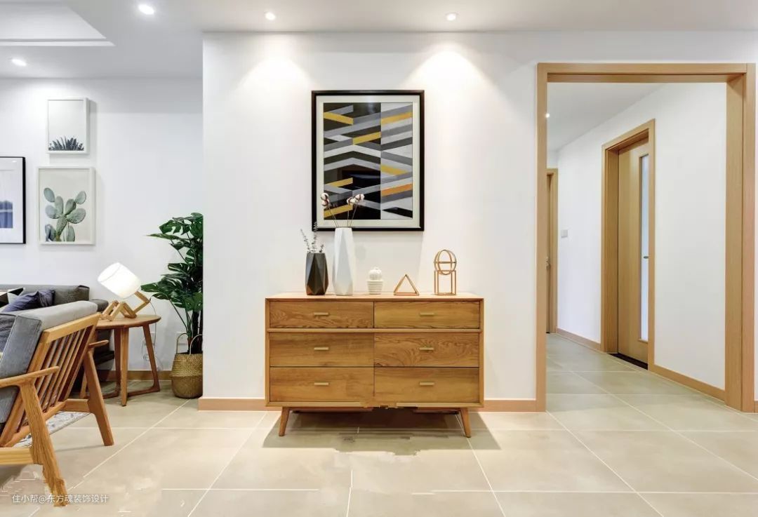 正对大门的柜子,可以收纳一些零碎的东西,如果在放上绿植、挂画搭配就非常有格调。