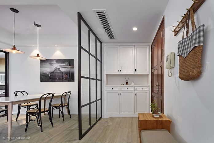 如果你家客餐厅在一条线上,那么可以像下面这样,在入门右手边宽一点的墙面设置玄关柜,左边的窄墙可设计隔板和挂钩,实现强大的置物功能。