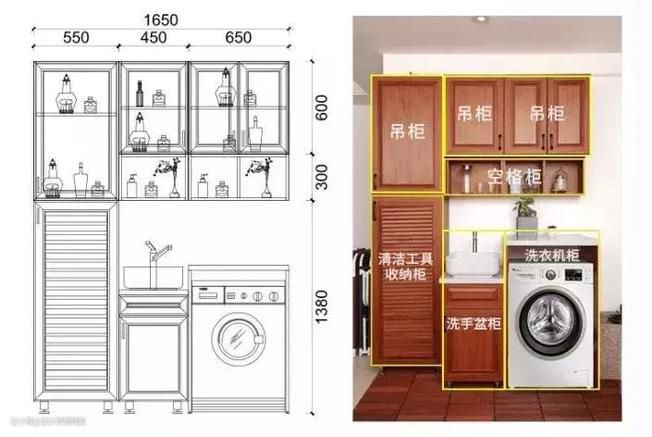 要想来得方便,最好的办法就是选择一个洗晾一体的阳台柜,柜子、洗衣机、水槽一个都不缺!尺寸、布局可以参考下图。