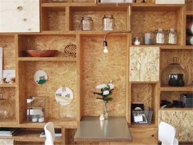 定向刨花板极具装饰性,不同树种生产的定向刨花板可呈现不同的纹理与色彩。不同于细腻而光滑的人造板,由于刨片纵横排列,定向刨花板表面具有独特并且粗犷的肌理。作为装饰元素应用于室内装饰具有自然、生动的效果。