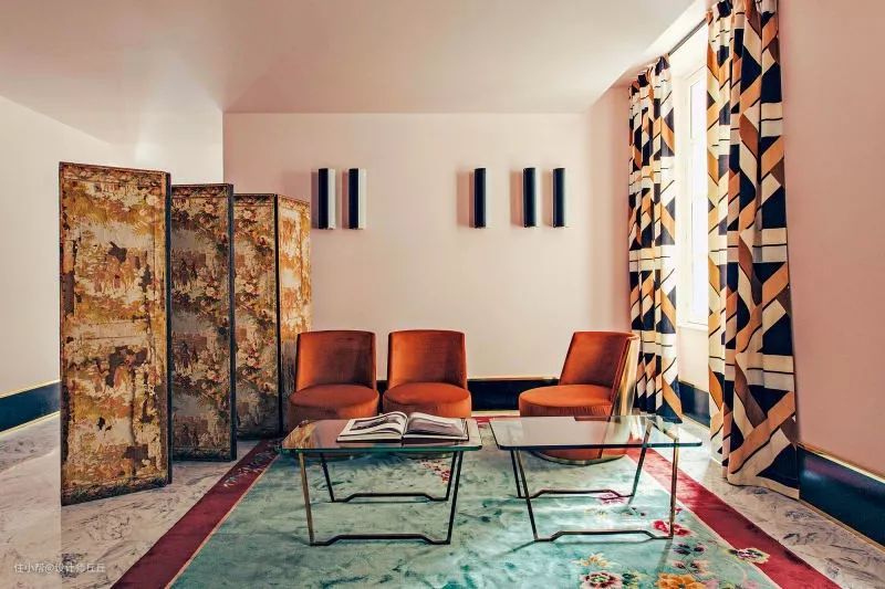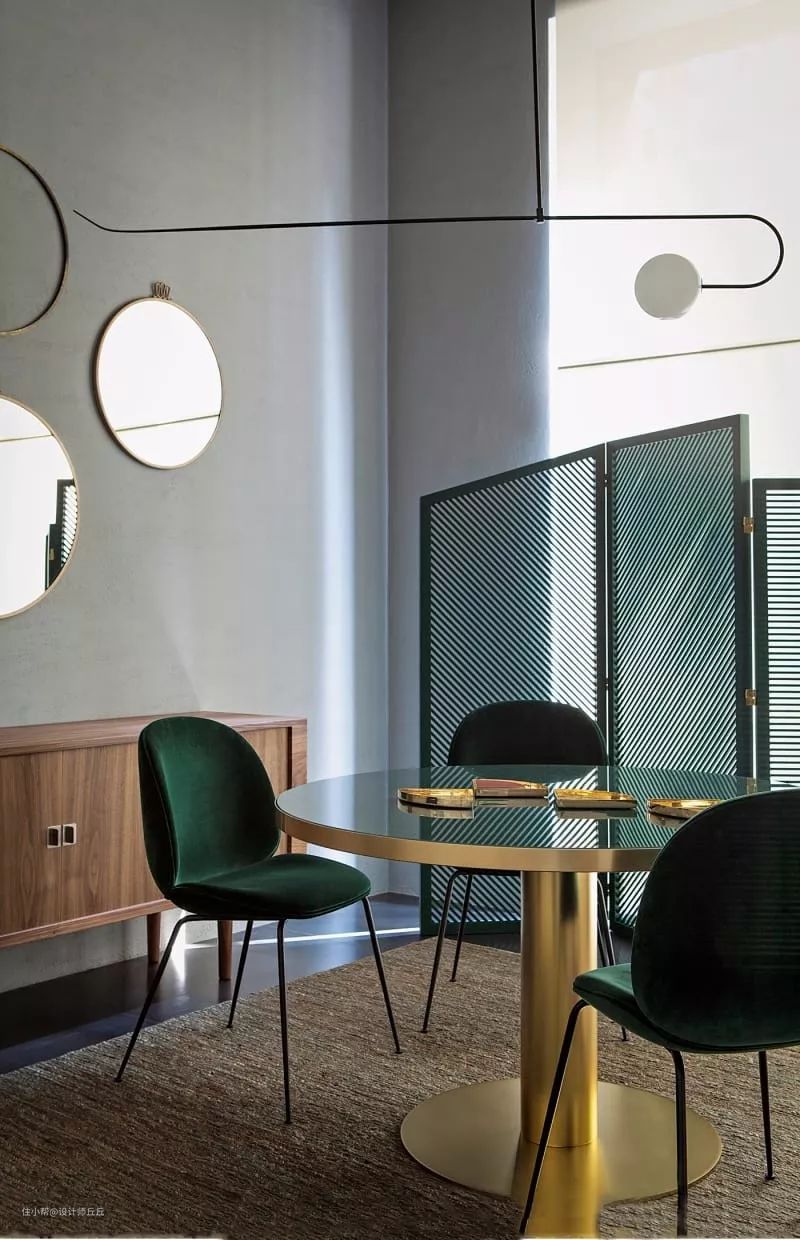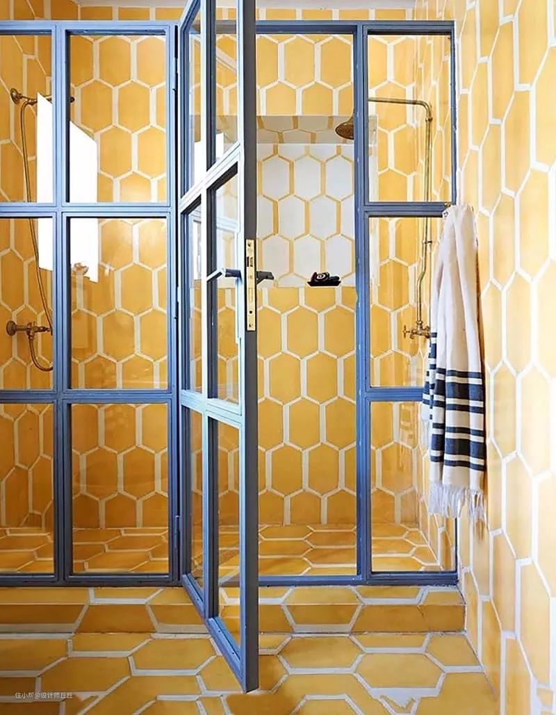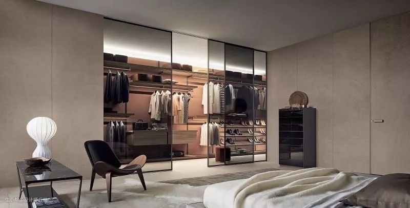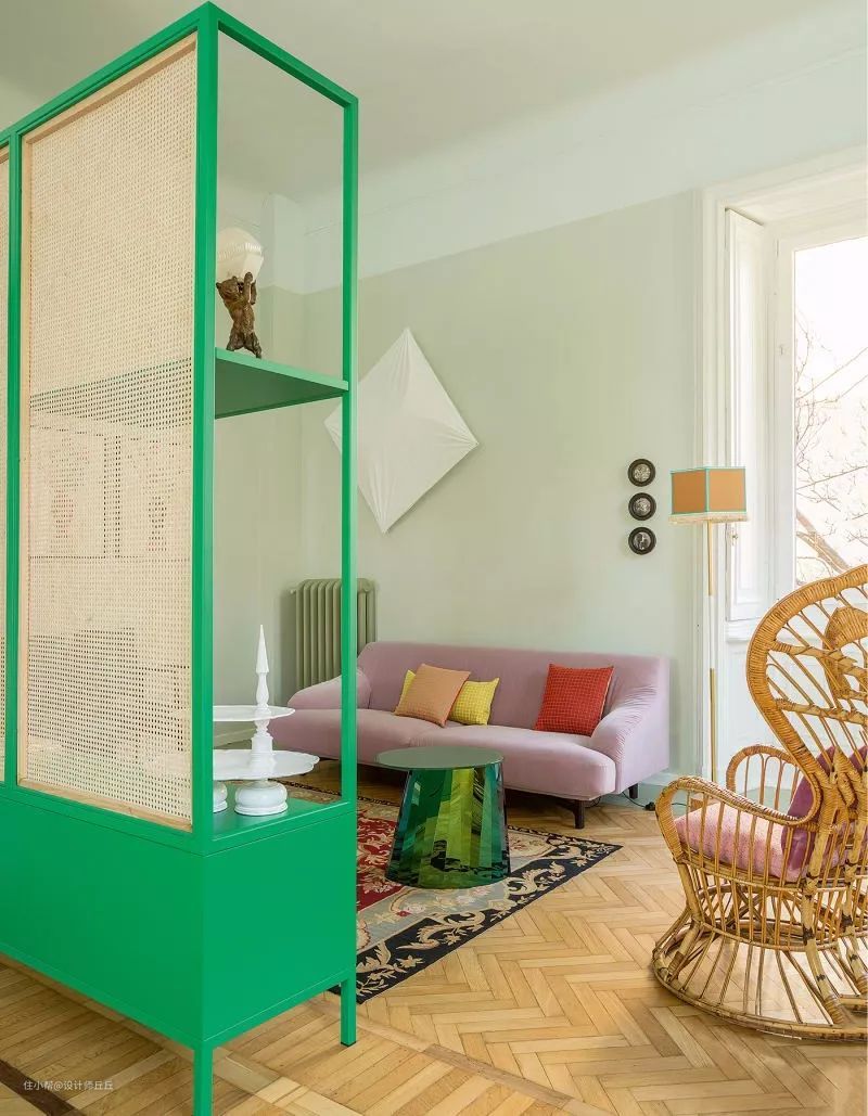 ▲房间隔断在浴室中很常见,它们将湿区和干区分开。在这个公寓中,设计师创造了一个精致的大理石,镜面玻璃墙,采用彩色磨砂玻璃面板。