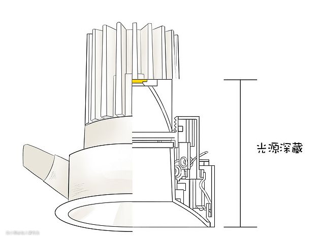 光源深藏主要是通过变大遮光角,从而达到防眩的效果。这种方式让光源的范围缩小,遮住一部分的光源,保证人们在一定的视觉范围内无法直接看到光源,减少直接眩光。这是一种较好的防眩手段,效果也很明显的。只是,通过这种手段来防眩,灯具的高度一般比较高,对预留的天花高度有一定的要求。