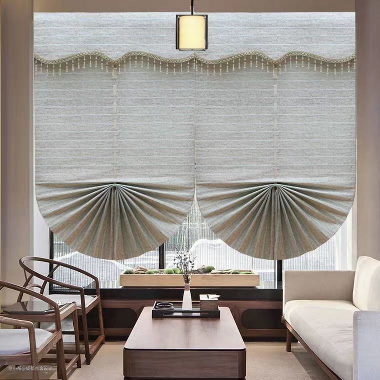 罗马帘是由布料缝制在一起的窗帘。拉拽抽绳能从窗帘下摆折叠收起,只需要少放下窗帘,就能够阻挡阳光与上方的外界视野,与卷帘相比,罗马帘具有独特的布料褶皱之美,比较适合浴室或者厨房