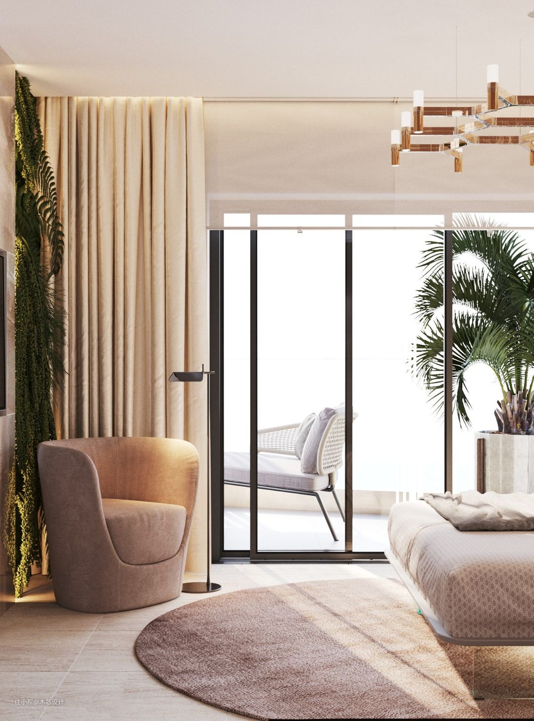 卧室与阳台相连,采光通风非常的好,还精心布置了绿植,自然又清新,营造了一种贴近自然的舒适感,是卧室的点睛之笔。还配备了一台电视,电视的嵌入式安置非常的巧妙,不占地方。休闲的沙发和一盏造型极简的落地灯,非常适合在睡前安静的看一会书。