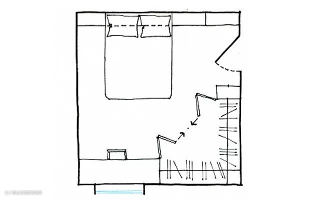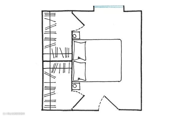如果卧室的入口正好斜对室内窗户,你也可以将整个布局旋转45度进行设计。在保证基本的生活需求和居住舒适性的基础上,衣帽间的面积也可以顺势增大,利用转角瞬间变身为一个L型衣帽间。