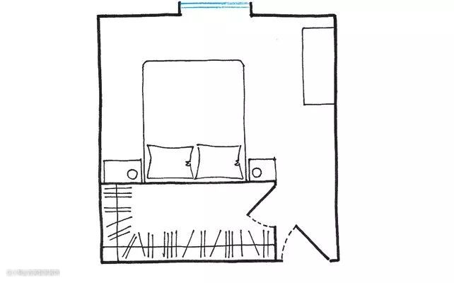 长方形的卧室可以像下面这样布局,既不影响生活动线,又能拥有一个方便更衣和收纳的专用空间。
