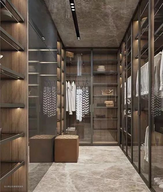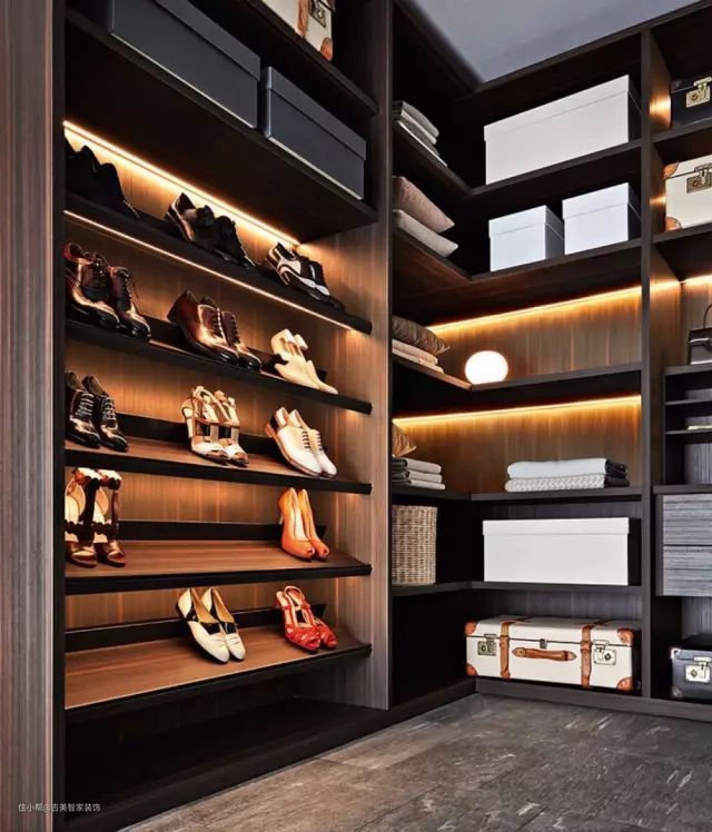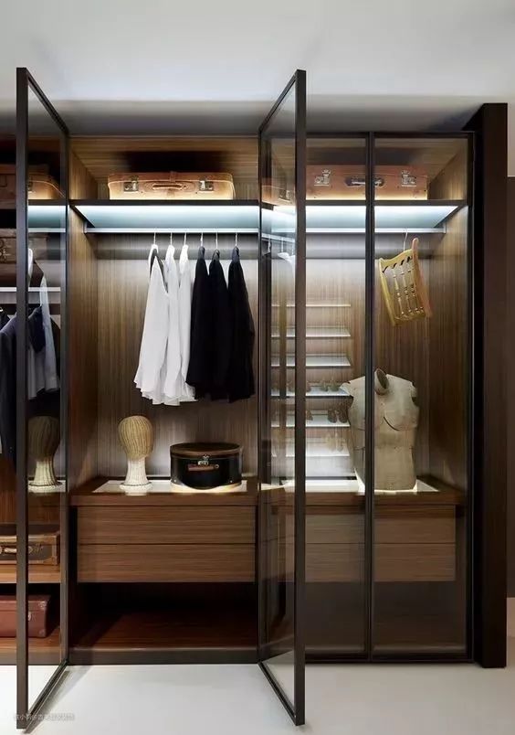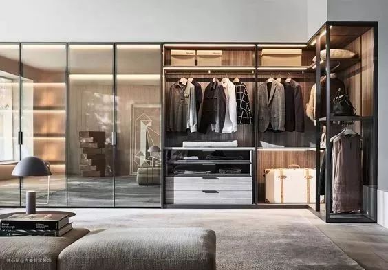 比如:男士衣帽间需要设计很多不同高度的隔层或抽屉,用来放置领带、衬衫、皮带等,让整个收纳看起来整齐明了,不但拿取方便,而且也是高品质生活的象征。