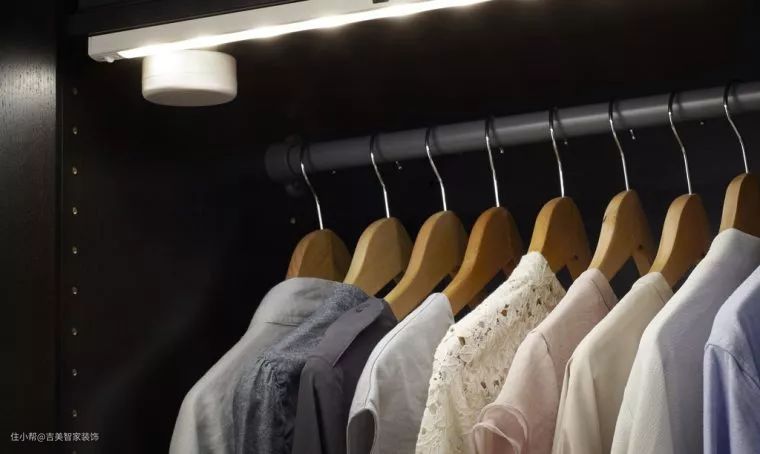 因为柜子里侧的衣物难以看到,我们最好选择色温接近自然光的灯具,也可以使用暗藏式的衣柜感应灯,来避免集中式照明带来的衣物色差问题。