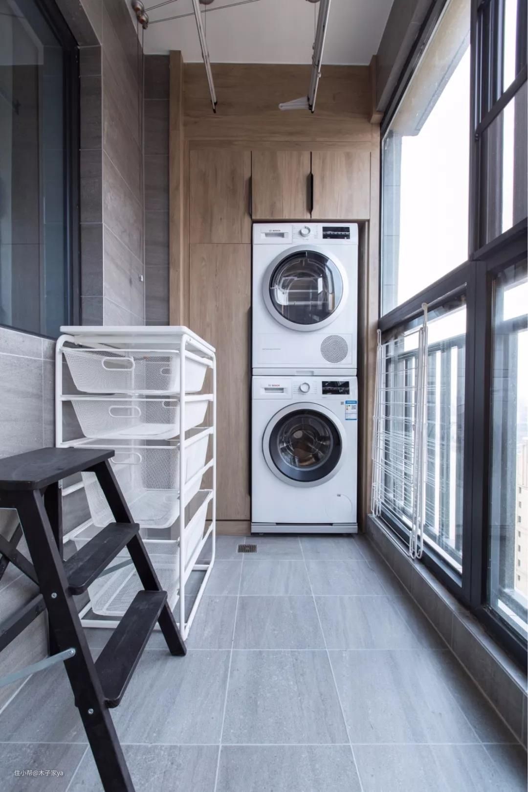 如果有阳台,但是封闭起来了,可以考虑阳台一侧阳台柜,放洗衣机+烘干机,另一侧可以做收纳柜、书桌或其他用途都可以。