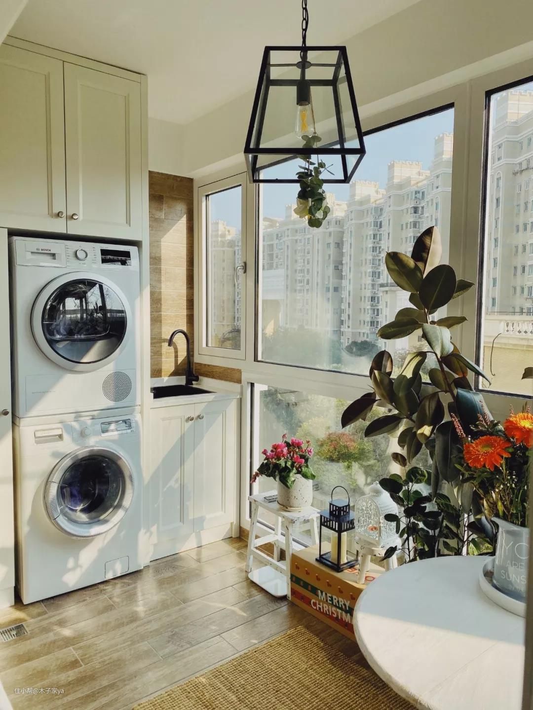 放阳台是一个不错的方式,把所有清洁用具放在这里,增设一个洗手池手洗衣服再放烘干机也方便。