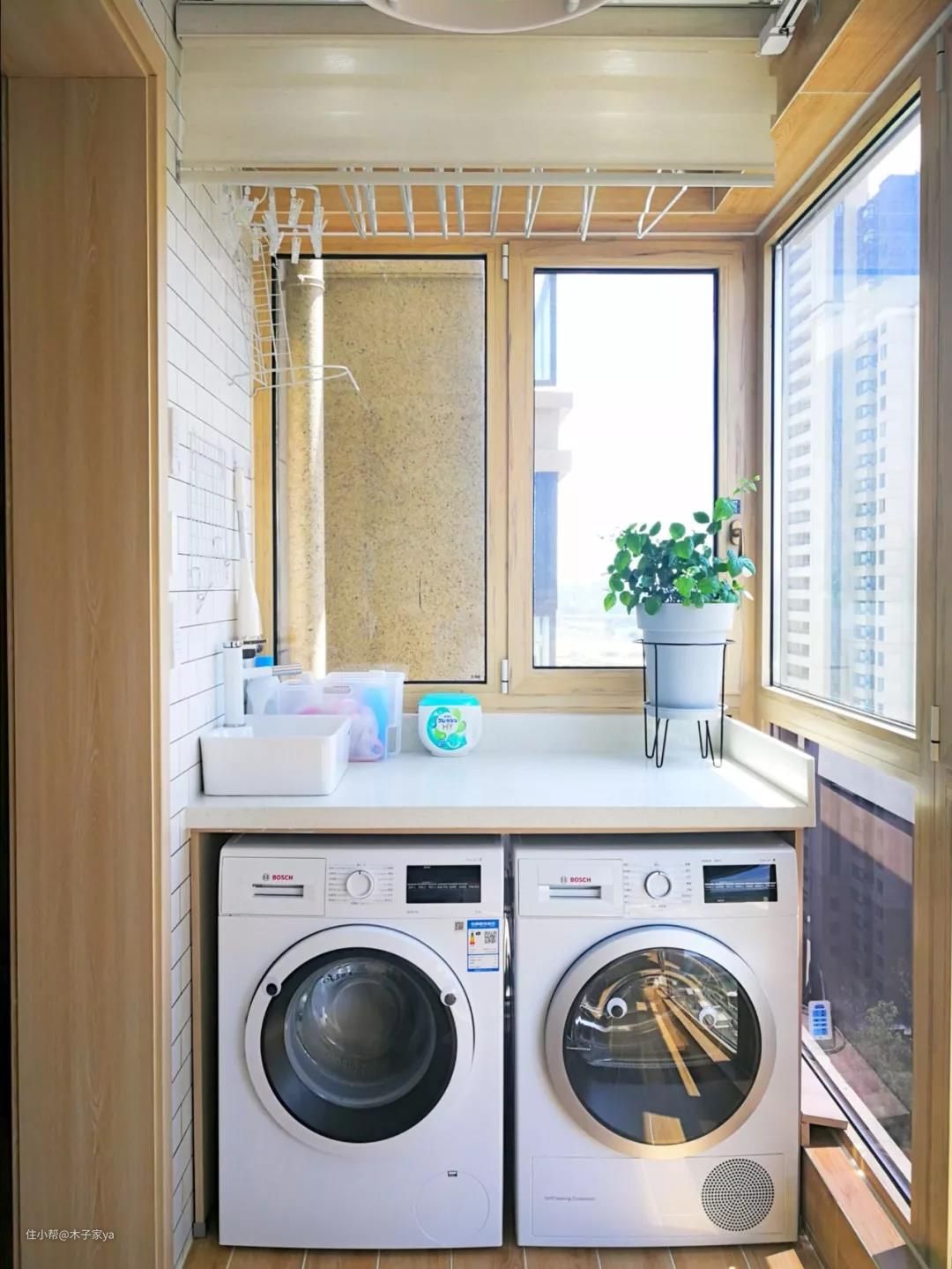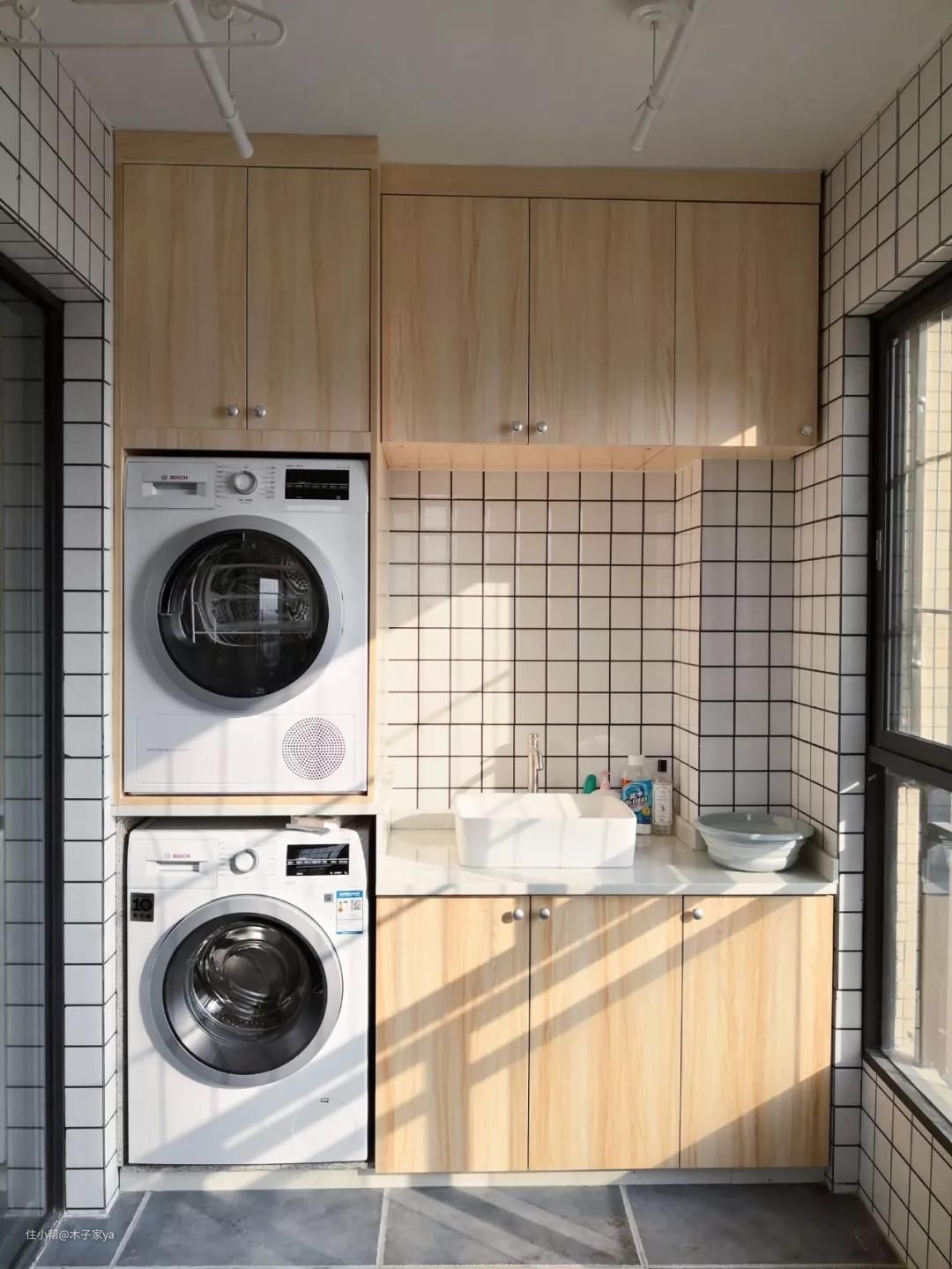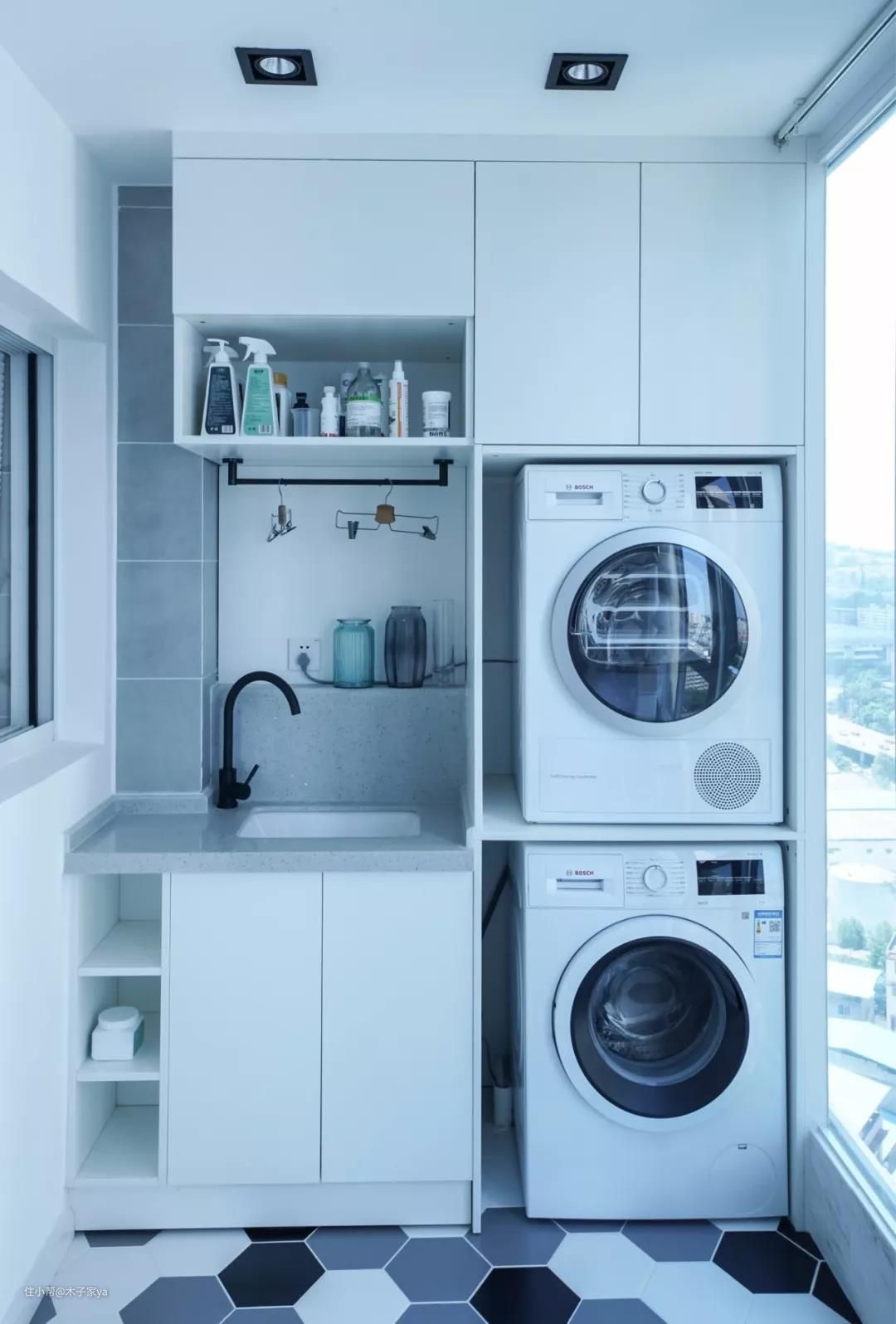 一、洗衣机+烘干机放在阳台,做阳台柜实用