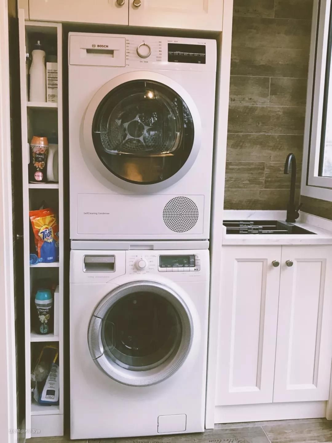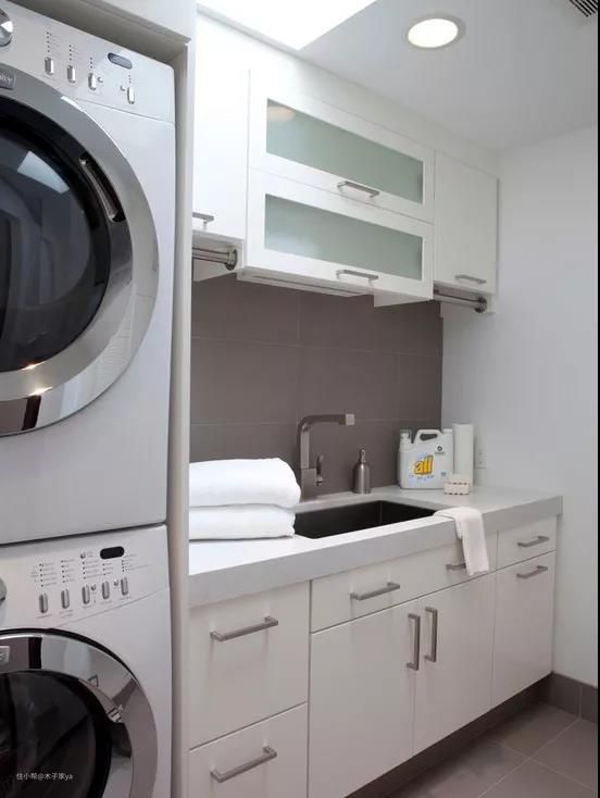 3、地柜+吊柜的定制组合,把洗衣机+烘干机收纳进来,要提前量好尺寸,避免出问题。