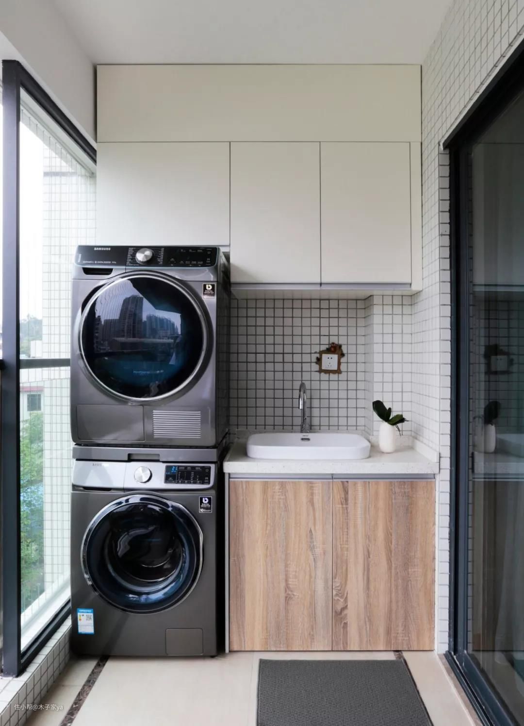 洗衣机+烘干机放卫生间其实很合适,动线流畅,洗完澡直接把衣服放进洗衣机,减少挪动的步骤。