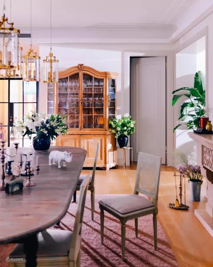 餐厅摆放着一套灰褐色的实木餐桌椅,与金色的北欧风玻璃吊灯搭配,还有浪漫的烛台、复古的餐边柜、清新的花草……处处都是生活的诗情画意,在这里用餐,一定很幸福吧~
