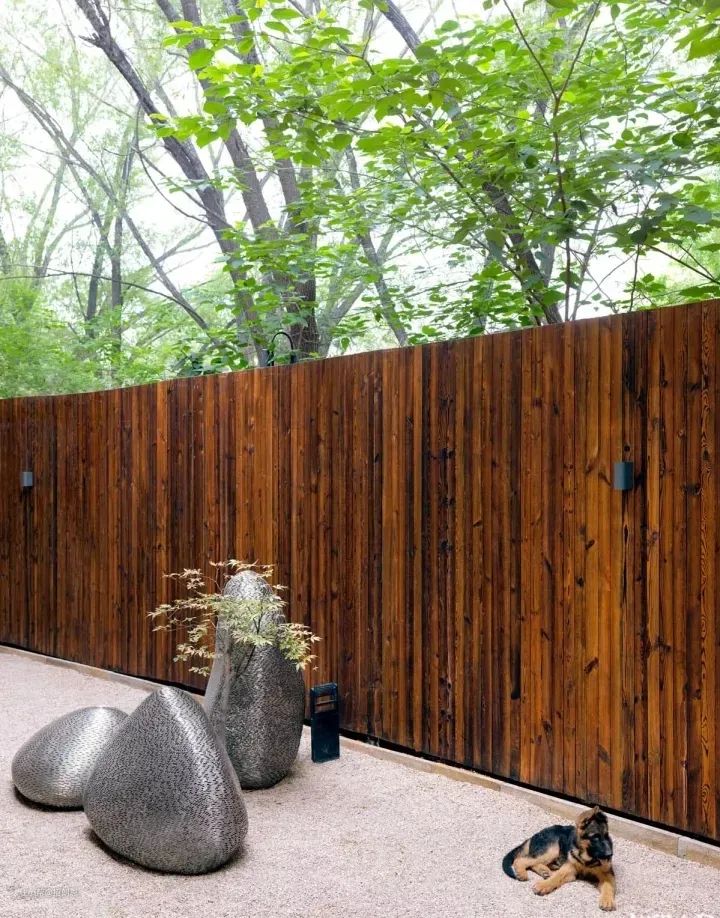 老旧的木栅栏与郁郁葱葱的树叶相衬,如同油画一般,地上摆放的“石头”并不一般,是精心雕琢的艺术雕塑。