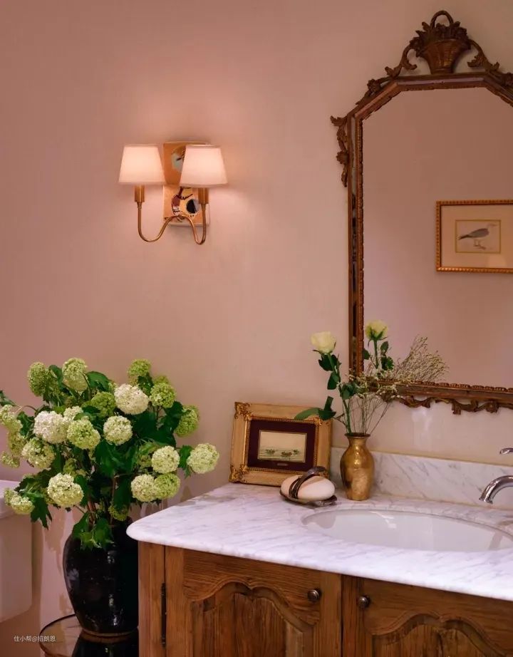 黄铜的镜子和相框,搭配大理石和实木的浴室柜,显得更加复古摩登了,无处不在的花卉更是点亮了空间,墙上的小壁灯渲染了温馨的氛围。这种美妙的搭配,院长觉得普通人也可以学起来哦~
