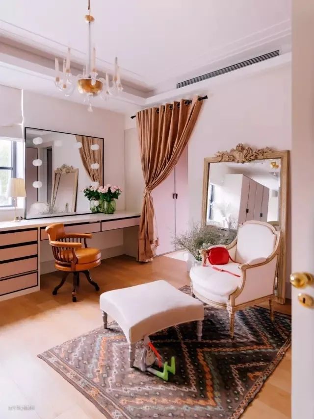 卧室里的梳妆区有两块镜子,桌面上的梳妆镜偏简约现代风,靠在墙上的镜子则充满复古法式风情,地上还摆了一束干花,文艺淡雅。