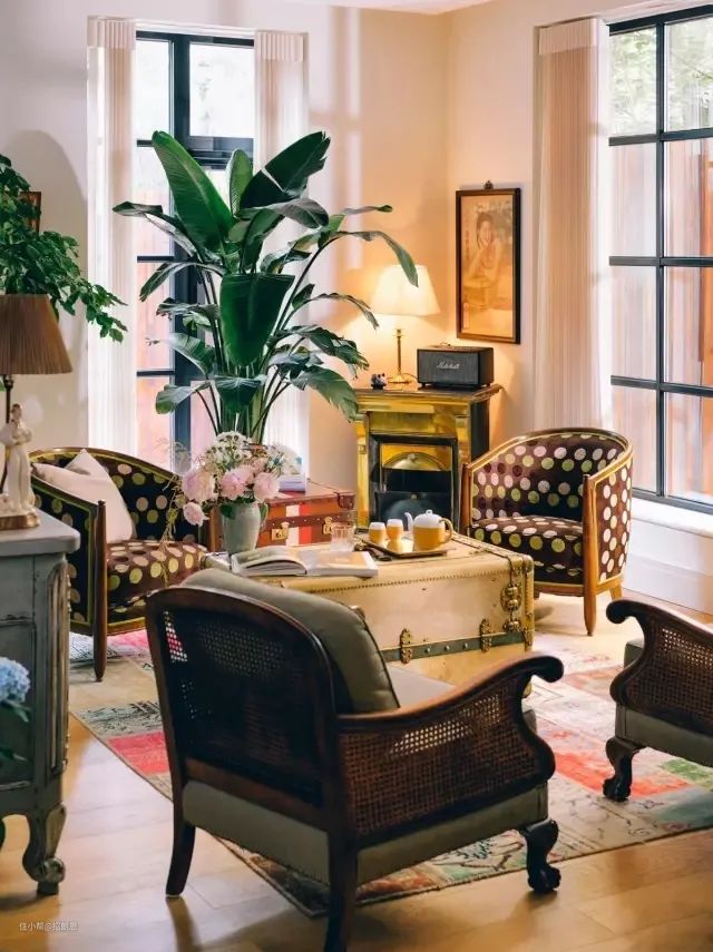 院长最爱的就是墙角的摆设,一个小小的金色壁炉和两张波点单人椅,一个充当茶几的复古欧式行李箱,搭配黑色的窗框和白色的窗纱,既复古又轻盈明快。