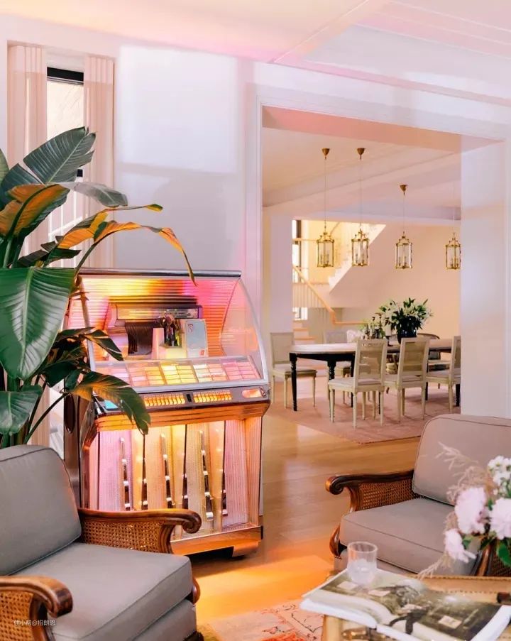 客厅另一个角落还放着一部粉黄色光影交错的点唱机,让人少女心爆棚,把家里变成KTV,原来可以这样浪漫!