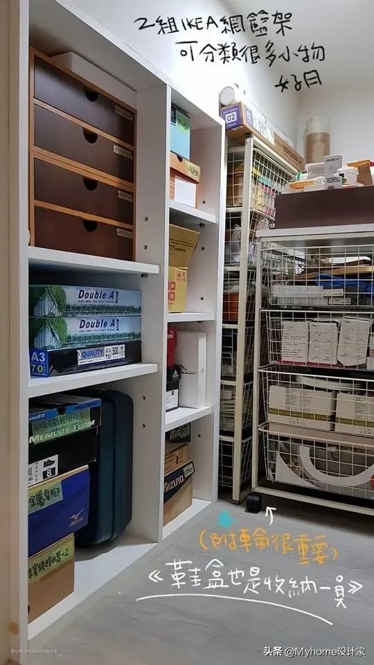 另一侧的收纳空间,将鞋盒也排列整齐,同时运用两组IKEA网篮架,可以分类很多小物。