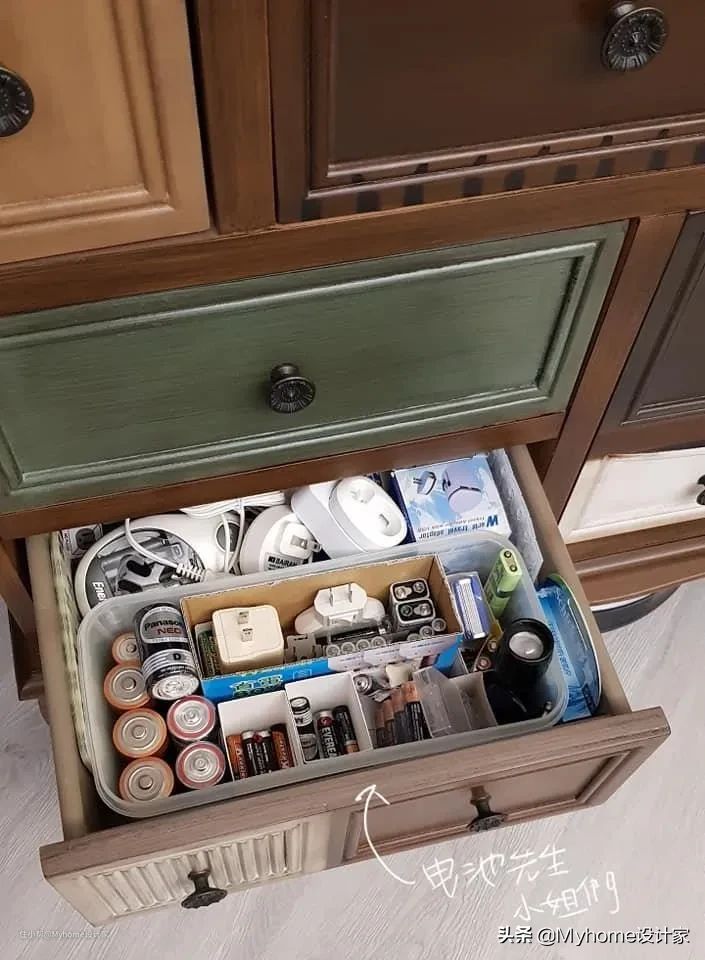 柜子里面的每一格抽屉,也都超整齐的,不论是电池、药品、牙线棒等,都摆放收纳整齐。