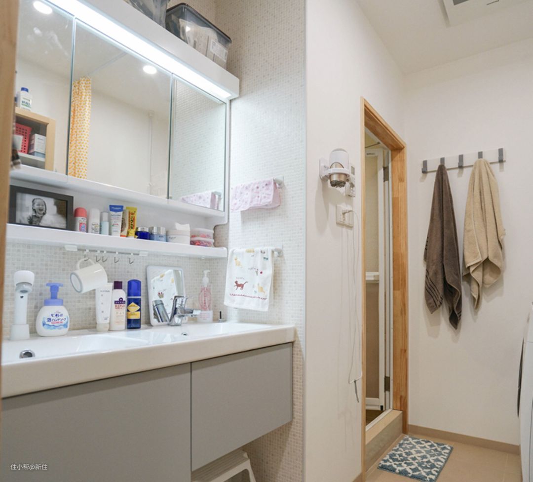 这就需要一个大镜柜来收纳,不过定镜柜的时候大家一定要注意,选择底部或者一侧有开放区放置常用物品的,这样台面才不会乱糟糟。