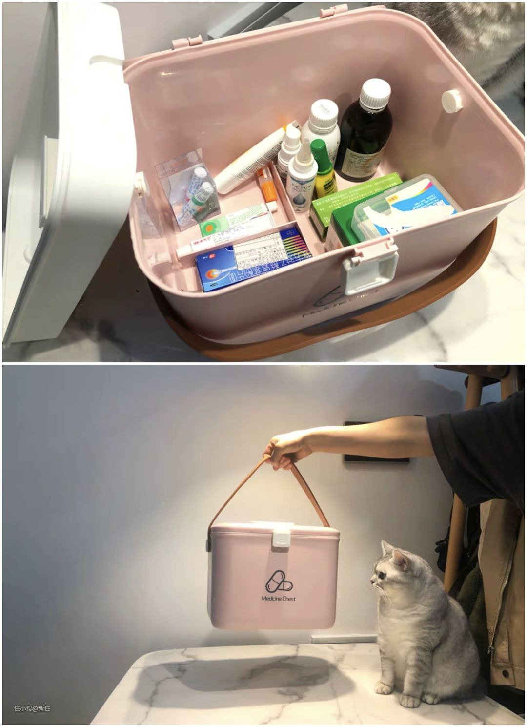 这款药箱颜值真的超高,材质厚实好看,有提手,随时能移动,药箱顶部还有一个可拆卸的小药盒,是为了方便带常用药的。药箱设计了安全卡扣,防小朋友误食,安全放心。