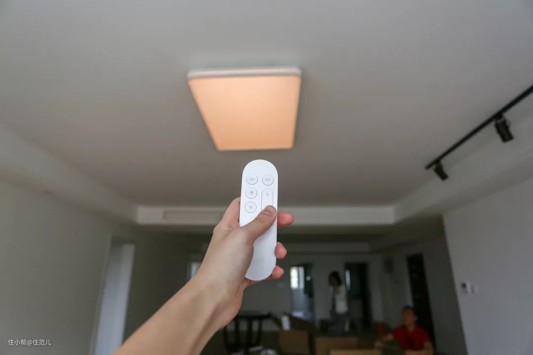 这款灯有四种操控方式:开关面板、遥控器、手机APP和智能音箱,由于客户还没入住,屋里没网,这里只能展示遥控器操作。