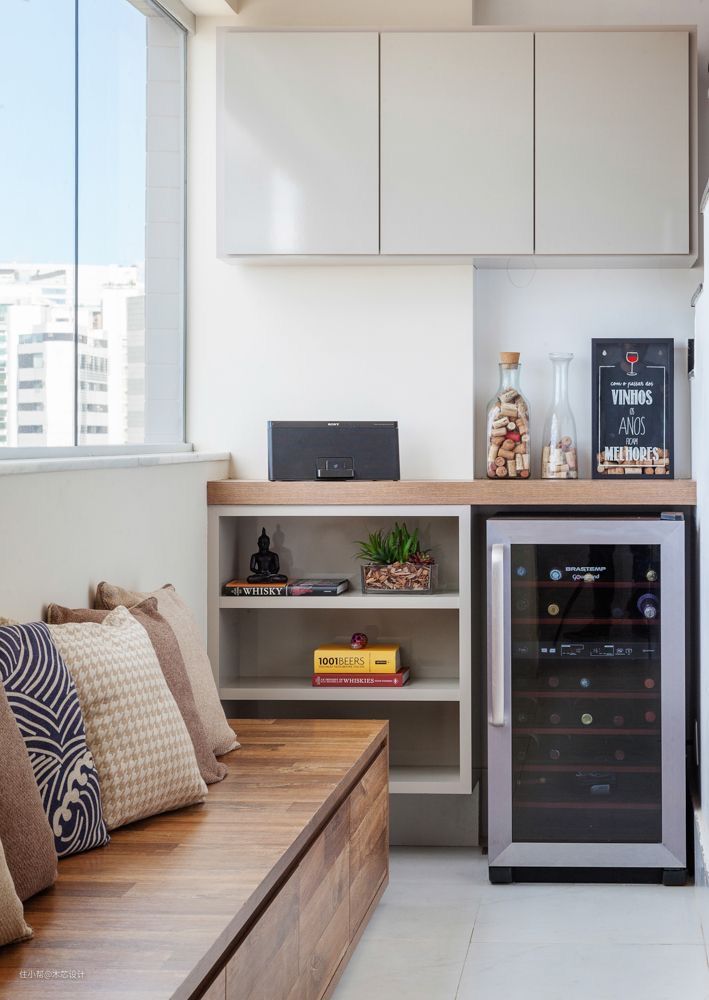 这样子我们就可以,把阳台和客厅进行分区使用。弄一个小吧台,放上一台红酒储藏柜,每天都能小酌一口,感受生活的惬意。