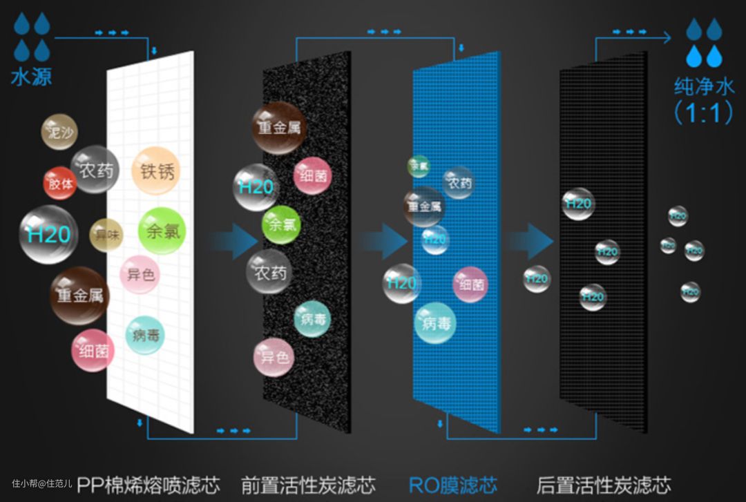 净水机的原理就是,用过滤材质把自来水过滤干净,看下市面上常用滤材和过滤效果:
